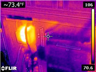![]() FLIR0001.jpg Move cursor (or tap) over image to see visual photo. The hot block is a power brick for a set of computer speakers. On the right is a computer not powered. |