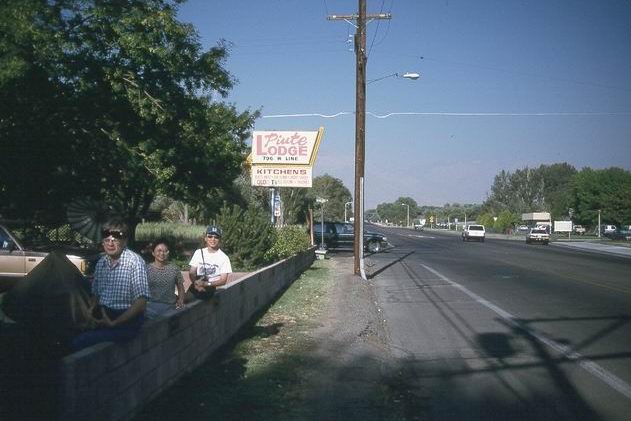 Up in the morning in Bishop CA. Arrived at Piute Lodge night before. I'm still remembered as the guy from Rhode Island. Jan, Su, and Hong-Nian posing by Route 168 heading west into the mountains. Had breakfast in Bishop, and back to finish packing at 10:30. Forest fires near Reno have caused severe haze in the valley, can hardly see the mountains.