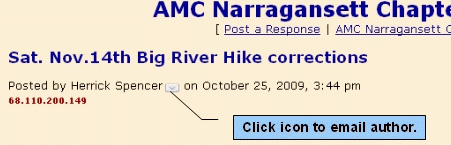 Please remember to use plain common sense and to not post anything you wouldn't want to say in public to another person of average sensibility. This message board is offered as a service to our members. The Narragansett Chapter makes no guarantees and will not be responsible for entries made by those posting messages. We will try to monitored for improper posting, and if you see any postings that you think are not related to the AMC or considered improper, please notify the webmaster