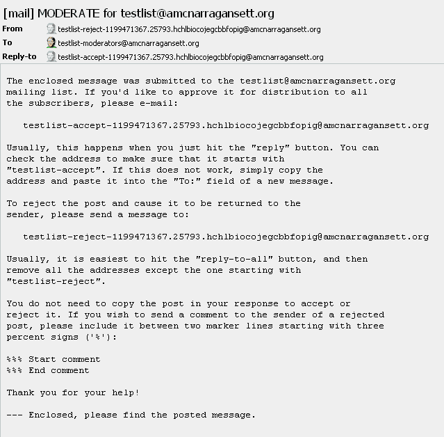 This "testlist" group has been setup for moderators to tryout and use the list-server without sending e-mails to any current subscribers in their own group. All activity leaders have been pre-subscribed as a moderator, but not as subscribers. A moderator who wishes to test the list-server should subscribe to the "testlist" group first. Any test e-mails they send will only go to themselves and any other subscribers in the "testlist" group. Any moderator can see subscribers to the "testlist" group by sending an e-mail, as in the above paragraph, to testlist-list@amcnarragansett.org. Test e-mails should be identified as “only a test” in the Subject line (you need a Subject otherwise it will not go through), in case there are other subscribers in the testlist. Put any test message to yourself in the body of the email. Send the email (use the email client you subscribed with) to testlist@amcnarragansett.org . You will get the confirmation email and can reply/send to the confirmation, as explained above. You will then get your test message in your email box from the “testlist” group. If after testing, you do not want to receive test e-mails from any of the other moderators, you should then unsubscribe from the "testlist" group.
