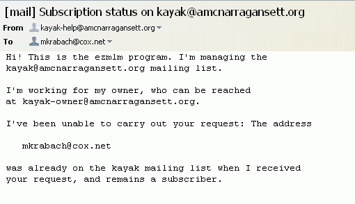 To determine if you are subscribed to any of the list-server groups, you can use the request word 'query'. As an example, to determine if I was subscribed to the sea kayaking group, I sent an email to kayak-query@amcnarragansett.org using my preferred email client. Note that if you have several email addresses, this will only check the email address that you are sending the email from. The response email is below. Ignore the robot statement "I've been unable to carry out your request..." and note that it states "...was already on the testlist mailing list when I received your request, and remains a subscriber." If you are not a subscriber your email reply will state "...was not on the testlist mailing list when I received your request and is not a subscriber of this list."