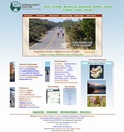 Some of the existing links may be obsolete or missing. Some links are still active and actually function to the AMC Outdoors.org website, with current events. Active links should not be trusted for being up to date or relinked. If you wish to visit the current Narragansett Chapter website use www.outdoors.org/narragansett