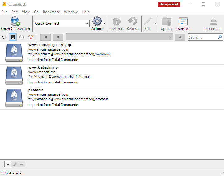 Cyberduck is a ftp program for either the Mac or Windows operating system. It is simple with intuitive controls. Download the program (for your operating system) from http://cyberduck.io/. Install the program on your computer and open the program. You will see the next image. If Cyberduck recognizes another ftp program on your computer, it will give you the option to import your contacts from your other ftp program. Which was convenient for this example because it shows the layout of the opening screen once you have an ftp site has been entered.