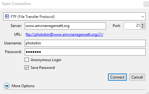 To transfer files to the Narragansett Chapter ftp site you will need to enter some information. The below image shows what to enter in the Server and Username fields. Contact the webmaster for the Password. Once all the fields are filled in, click on Connect.