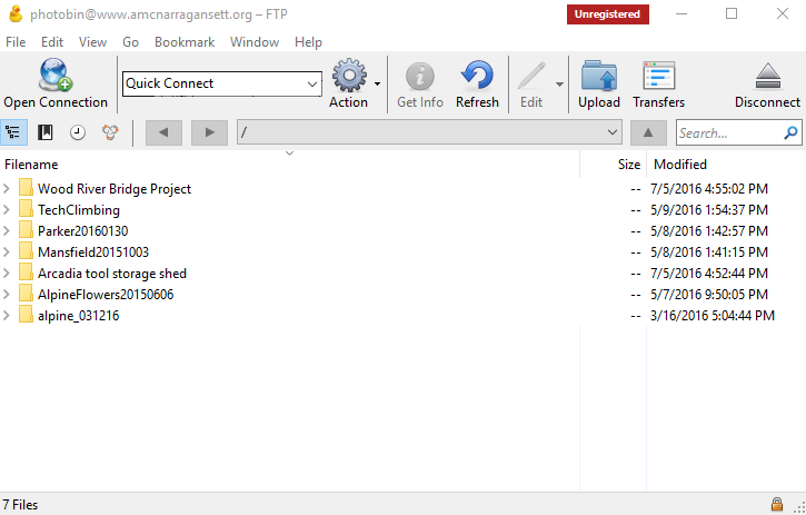 After connecting, you will see the directory or folder that was set up for communication, in this case "Photobin". The next image shows the folders that our site currently has (as of creating this help file). Ftp goes both way, and since you are logged into this site with certain privileges, you can download folders or files, or delete files or folders. So if you make a mistake and upload the wrong file your can delete that file or files and start over.