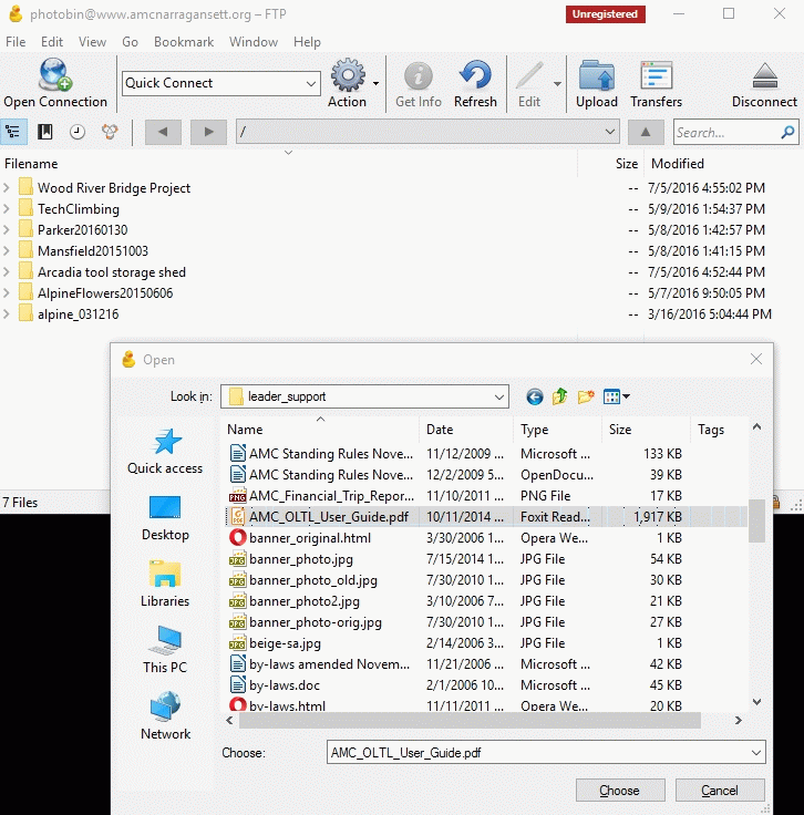 To upload a file or folder, or any group of files, click on the Upload button in the menu and a new window will open to your default folder. You can navigate to any other folder as you would normally do with a file manager. For this example I have navigated to the "leader_support" directory/folder on my computer and selected a user guide to upload.