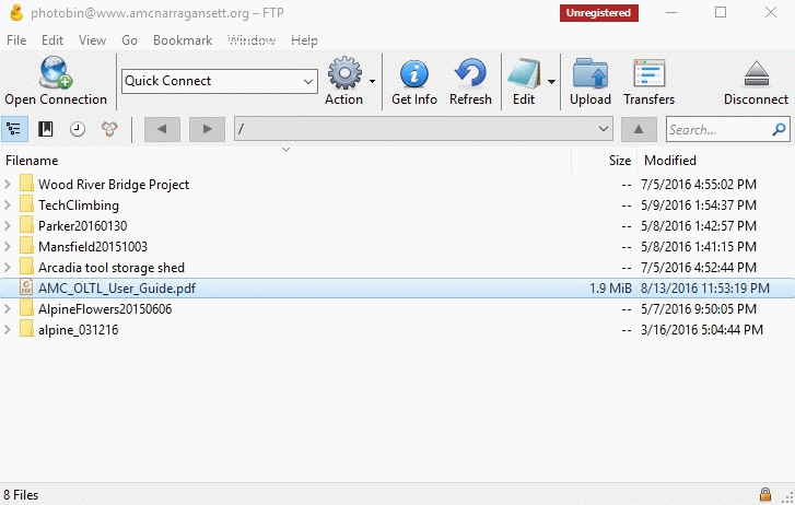 When finished, you will see your uploaded file in our host site. Note: If you have a group of files or several different groups of files or photos to upload, first make a New Folder to put the files in. You do this by selection of the proper operation in the Action button in the menu. Then open the new folder and use that for uploading. If you already have a folder on your computer with the files you want to upload, skip making a new folder and just upload the folder. The reason for new folders is purely so files from different members do not get mixed up.
