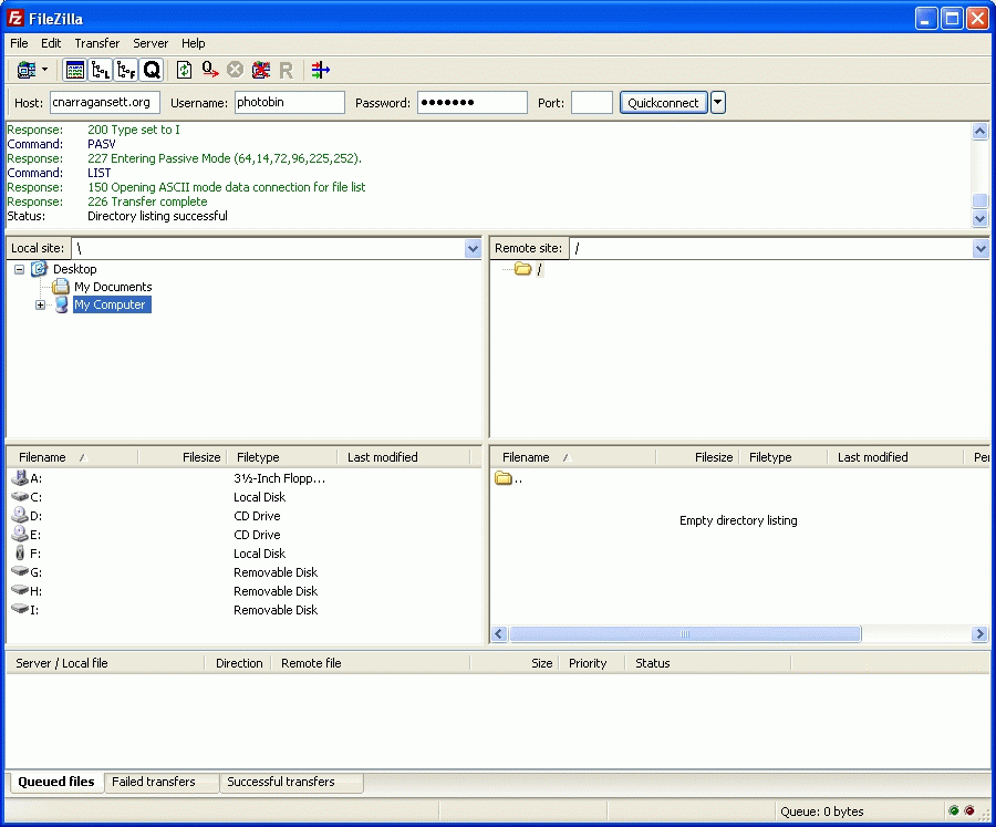Note: When you finish the program the username and password is saved in the history queue, so when you open the program up later to upload more files you only have to click on the 'down' button to select the link to connect to.