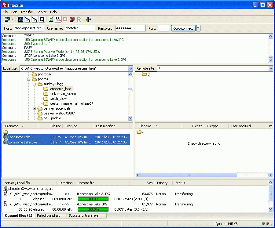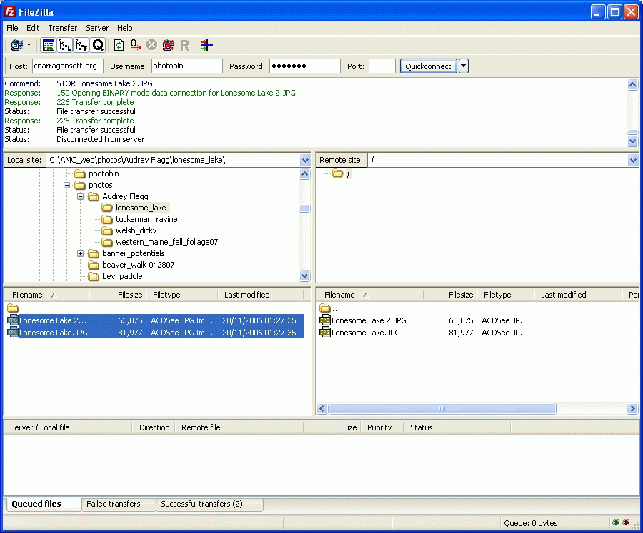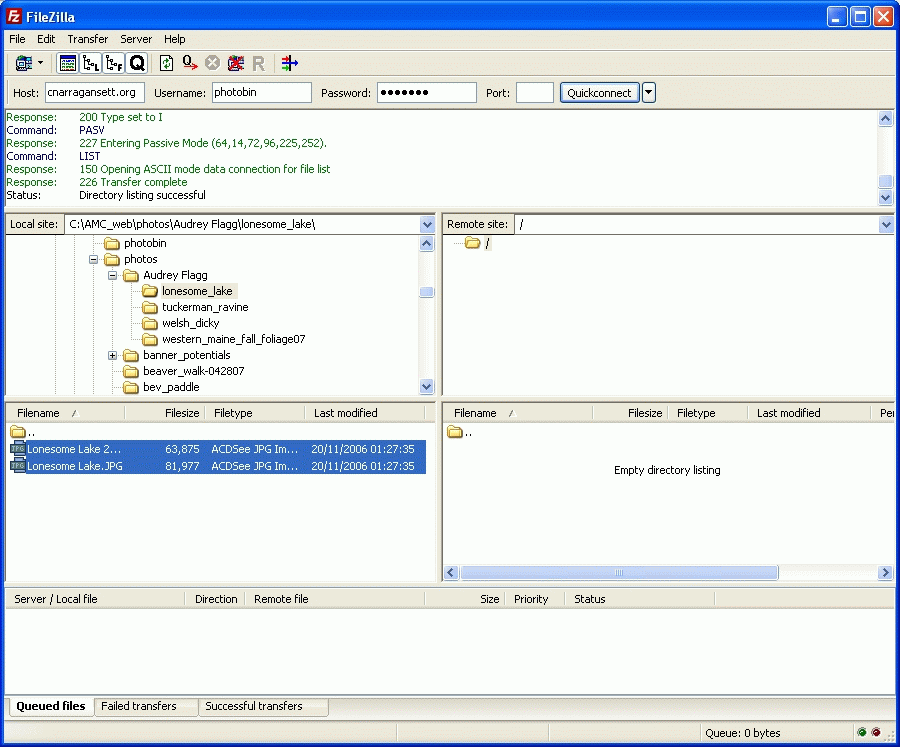 Notice that the files have been placed in the Queued files window and are transferring to the web site. When you drag the files to the Remote site the program automatically puts them in the queue window for you. When the transfer is finished you will see the files in the Remote site as below.