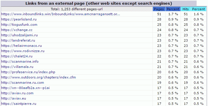 The following statistics show who is linking to our site during this month from another site, as in a link. (Note: Removed Russian htaccess.)