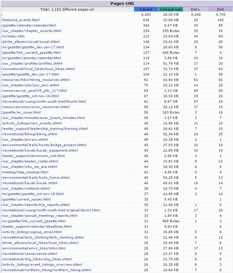 The following show the top URLs accessed during this month on our web site. These show how often various pages are being looked at. Below is a limited snapshot of the pages viewed. The full monthly listing is here. Note: The full monthly listing is a normal web page, meaning you can click on any of the data links and go to the referenced page. So if you do not recognize a page url, click on it and you can view the page. Note: "/featured_events.html" will register each time the front page is visited or refreshed.