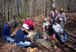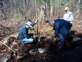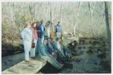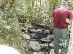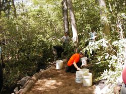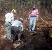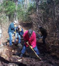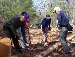 Our first trails project of 2005 included the placement of stepping stones in a very wet portion of the Trail, as well as the digging of a few drainage channels. The weather was perfect for playing in the mud! After the rock work, we continued with brushing on the John B. Hudson Trail. Trails members checked on the trail following a heavy rain and reported evidence of proper draining of water from the area.