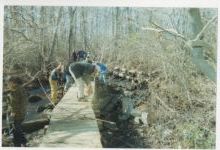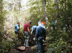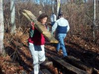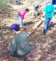 Two projects were completed today by a group of hard working volunteers. The first project was the construction of a 17 foot bridge over a muddy area. The second project was to construct a rock turnpike. A rock turnpike is an elevated walkway that spans a muddy wet area. Large stones are first laid on the ground, with smaller stones sandwiched in the cracks between the large stones. The final step is to put a layer of soil on top of the stones. The result is a nice walking surface. A special thanks to Shirley Cummings for taking the pictures.