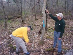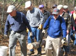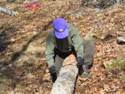 (Trails/Conservation) Nature Conservancy developed this trail in Charlestown with help from AMC in 2003. Today we placed four 19 foot water bars on a slope to control erosion. The pictures show the trail crew hauling a freshly cut tree, removing the bark, and placing the water bar in its intended location.