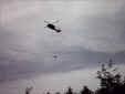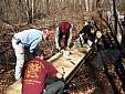 To enable the chapter's trails committee to replace some worn-out log bridging over a stream and its approaches on the Narragansett trail near Long Pond/Ell Pond, an efficient means of bringing the lumber materials to the site were needed. Manually carrying the lumber from the trailhead to the bridge site was ruled out, due to the extensive amount of materials and the difficult trail terrain. Bringing the materials in by boat on Long Pond or sliding the material on the ice on this Pond during the wintertime was investigated and ruled out as not being possible. The only other option was to airlift the materials. The Army National Guard was contacted in late 2006 and an airlift was initially scheduled in 2007, but was ultimately postponed due to National Guard support personnel being unavailable on the scheduled date. Eventually, the airlift was re-scheduled to March 27, 2008 and the airlift was successfully carried out. The lumber was brought from the lumber supplier to the parade field at Boy Scout Camp Yawgoog and divided into three bundled loads. The Blackhawk helicopter airlifted each of loads (in three separate flights) the one mile distance to the drop point, a rock ledge above and next to the trail near the bridge site. The loads were lifted from the ground and eased to the ground using a sling and hook method, to enable the helicopter to hover above the loading/unloading points, during the transfer of the materials. This was the first time in the history of our Chapter, that we have moved trail project materials by this method. (CSchafer)
