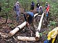 The following pictures show the crew hard at work in the various phases of the project: Stripping the Logs, carrying the Logs, implanting the logs, and the final results.