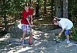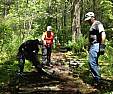This year's National Trail Day Weekend event was a great success with a huge amount of work accomplished over Saturday and Sunday. A few volunteers took advantage of the free campsites offered for the weekend, but most commuted for one or two days work. The primary project goal of making significant improvements to a few sections of the Walkabout trail where it is very muddy and wet year-round, such that hikers will be able to comfortably pass through these sections, was met with dedication, fun, and camaraderie. Many timber beam bridges and extensive stretches of log corduroy were constructed under the leadership and direction of Chris Shaffer, our chapter Activities Chair. Volunteers from our chapter, as well as from Tony Chernasky's crew at RI Hiking Club, (with many belonging to both clubs), worked together with the highest degree of cooperation, enthusiasm, and commitment. A lot of the work was difficult. Heavy lumber and tools all had to be hand carried down the trail to the construction sites. Logs for the corduroy were harvested on site from nearby woods and then rolled, dragged, and carried to the installation sites. All was completed safely, with the end results being a lot of high quality workmanship and a lot of very tired but very happy volunteers. Unfortunately not everyone made it to the photo gallery, but then that's not what we were there for, We were there to work. And I can tell you... EVERYONE WORKED, AND WORKED HARD! It was hot, it was dirty, and it was buggy... and everyone still gave 100%. (B. Tessitore)