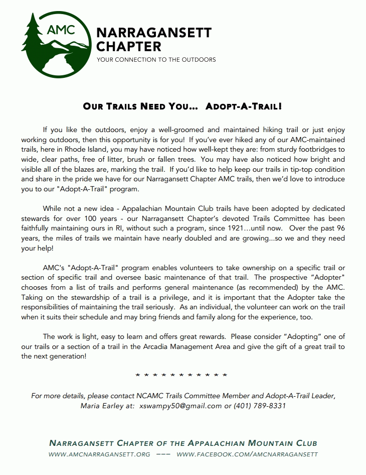 2001 was the 80th anniversary of the founding of the Narragansett Chapter of the AMC. To celebrate this milestone, Jennie Crooks, Marjorie Gaunt, and Ann Perkins of the Trails Committee updated a brief history that was written in 1984. Look at old photos and read about of this interesting Narragansett Chapter Trails history.