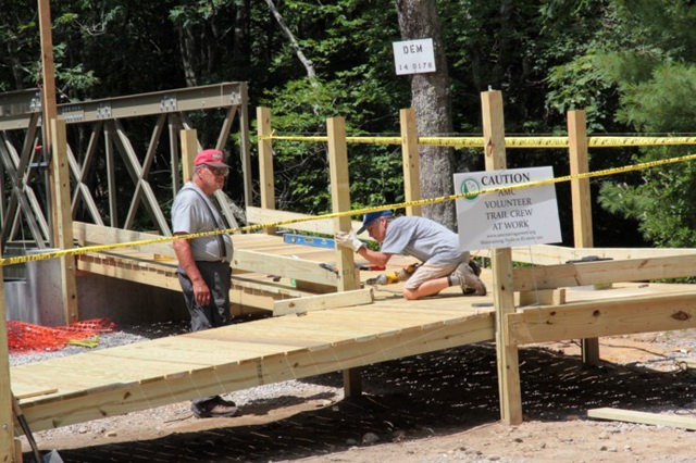 The Chapter was awarded a $100,000 Recreational Trails Program grant in 2013 to construct a bridge over the Wood River on the Mt. Tom Trail. The purpose of the bridge is to eliminate the need to walk on Rt 165 in order to cross the river. Over the following 1 1/2 years, an engineering firm was contracted to obtain necessary data needed to apply for a wetlands permit which was finally issued in October 2014. A fiberglass truss bridge was selected and an engineering firm was contracted to design the concrete abutments. The abutments were installed by a contractor in May 2015. The bridge was ordered and it was delivered unassembled on July 11, 2015. Assembly was done in the east parking area over the next 12 days by many volunteers and was lifted into place by a crane contractor on July 23, 2015.