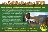 Fri., Oct. 18-20 AMC Fall Gathering 2013. (registration closed) This year's AMC Fall Gathering, hosted by the Delaware Valley Chapter, will be held at Camp Speers-Eljabar YMCA in Dingmans Ferry in northeastern Pennsylvania, right at the edge of the spectacular Delaware Water Gap National Recreation Area. The Fall Gathering is a club-wide event of outdoor activities such as hiking, biking and paddling, along with social hours, dinners, a Saturday night barn dance and campfires. There will be members from all twelve AMC chapters in attendance. Read more...
