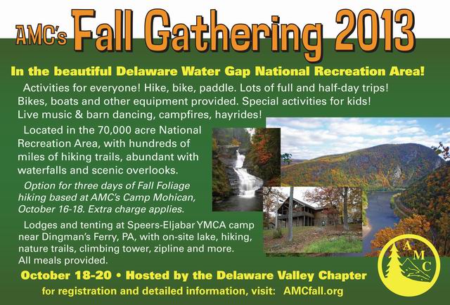 This year's AMC Fall Gathering will be held on the weekend of October 18-20 at Camp Speers-Eljabar YMCA in Dingmans Ferry in northeastern Pennsylvania, right at the edge of the spectacular Delaware Water Gap National Recreation Area.