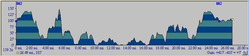 The bike route shown as red dotted line from West Kinston to Pt. Judith and back.