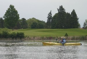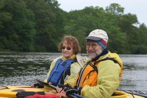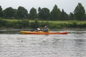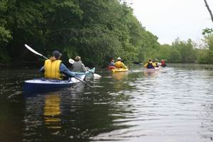 A great group of folks paddled the Ten Mile River in Pawtucket on Saturday May 23, led by Antoinette & Herrick. We met at the Pawtucket Country Club, where we left our boats and headed off for shuttle duty. The best part was that the Club has nice clean bathrooms! Every put-in should be so equipped. Just don’t let on to the Club that we know this little secret (front of the clubhouse, through doors of smoked glass, take a left, on the left side of the hall). Waiters were setting up the banquet room across the hall - I was sad that we were too early to crash a wedding in our formal paddle skirts. Keith Gonsalves from the Watershed Council (and President of RI BlueWays) greeted us and invited us to future paddles he has organized but wasn’t able to paddle today. See riblueways.org for those paddles. We were already a half-hour behind schedule as people continued to show up and the rain tapered off. The 3-mile drive to the take-out turned into a 30-minute tour of Pawtucket and Seekonk backroads because of the Memorial Day parade. Apparently no one had told the city fathers that Memorial Day wasn’t until Monday. But by the time we were back and ready to launch the rain had stopped.