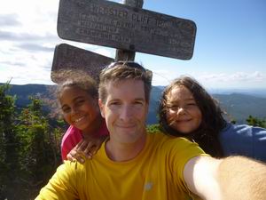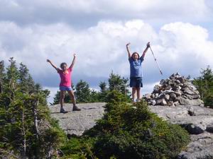 The girls on Mt. JacksonThe trip to Mt. Jackson had a few minor ups and downs, a well bridged high bog, and a few brief views of the summit ahead of us. In about an hour we reached the final ledgy pitch to the summit and I had the pleasure of watching two tired faces light up as they neared the summit of their first “big” mountain. The closer we got to the summit the faster the girls went until I saw them both, arms upraised, by the summit cairn about 100’ ahead of me. Girls summiting JacksonI quickly joined them and spent about an hour looking up at the Presidential Range, looking down at places we had been, making friends with bugs, and practicing our latest dance routines. Mts Ike and Washington from JacksonAs much as I knew the girls would enjoy summiting I was surprised at the amount of joy and excitement they exhibited. For the first time, this wasn’t just “Dad’s thing”; it had become a true family experience. Matt and girls on Jackson |