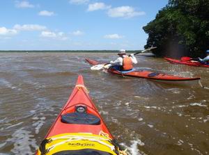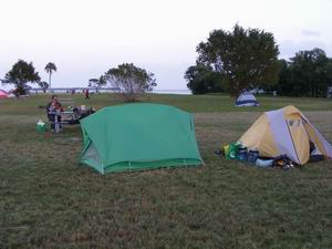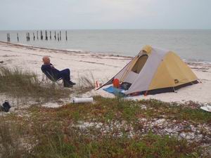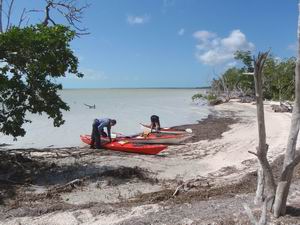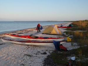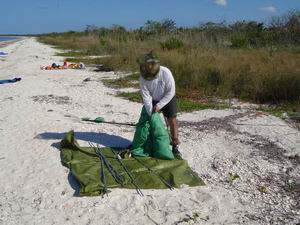 Brown Pelican in tree.That night we did not leave our tents, having learned our lesson the previous night. Next morning we overturned our kayaks to get ready for loading gear. The local raccoons are a problem with camping on the beach. They will explore everything and chew anything if there a reward of food or water. So we had overturned our kayaks on the sand and put the water bags back in the forward part of the cockpit. On both mornings there were raccoon prints everywhere, including prints around our tents. Ray had one that was pushing against his tent, forcing him to swat the tent wall to drive him away, several times. Packing the tents wearing a bug net.The paddle back was easy with a light warm headwind that seemed to be in the 80's. The water was warmer than out on the end of the cape and seemed to be 80 degrees at least. Because of all the clay like silt, the water looked like light chocolate milk. We stopped for a lazy lunch on a nice warm beach knowing it would be our last until later in the summer in Narragansett Bay. A lazy lunch and siesta on a warm beach.The highlight of our paddle back to Flamingo was the shark sighting. Not really an sighting, because the water was so milky from the clay bottom we only saw the fins of the shark. The shark did not see us and I had previously almost run over him earlier in the day. The water along the coast was very shallow, usually only a foot or two, so the shark could not go deeper when I encountered him. We also saw a dolphin in the distance, but to far to photograph. Heading back in gray water.Wednesday was to be a decision day on traveling back to Rhode Island. I went (a 50 mile commute each way) into Homestead to find the local library to work on the AMC Gazette. But unfortunately my brand new laptop was not working very well and nothing got done. So I decided to head back with Gary and Ray ,and forgo a longer stay in the Everglades. We left Thursday and arrived back on Sunday. From my estimates that was more driving time than paddling time, but now we know the area and next year will be better. |