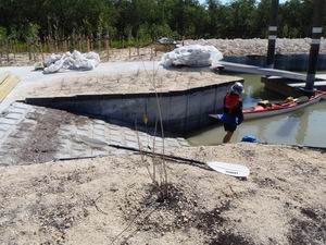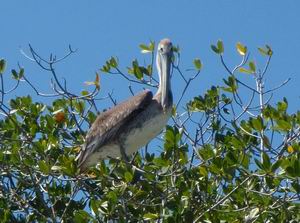 The wind had died down on this day and it was a leisure trip along the coastal beach. We passed the college students as they were resting on one of the beaches. After coming around the cape we found better landing conditions and a completely open beach for miles and miles. For all the waterfront congestion Florida has, the Everglades are a national treasure. Our campsite on Cape Sable.Because of a light breeze, we had not experienced any bug problems. But that changed quickly when during the night, leaving the tent to relieve myself, I was attacked by no-see-ums as I never have been attacked before. And that includes bugs in Alaska. They were small, they stung like pin pricks and the stinging did not go away. The moral of the story is don't leave your tent at night...period. Morning on Cape Sable.We decided to keep our camp site and not repack and move up the coast, but do a paddle into the East Cape canal and check out the passage to Lake Ingram, which was one of the loop circuits that could be paddled. Up the canal we investigated on of the flood control dams being repaired. Dam restoration project.The two in this area had been destroyed by the 2005 hurricanes. They had so called canoe ramps which were really too steep for practical purposes. The upper dam area was being planted with little trees and was also full of no-see-ums. We did not linger on the dam. On the way back, toward the entrance to the canal, we got good views of a large Blue Heron and a Brown Pelican in a tree.