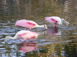 Heading into 20 mph wind on Coot Bay.We took a left along the side, thinking that we might find one of the outlets to another lake but decided to head back. So we headed out into 20 mph wind for awhile to get back to the canal where there was no wind to speak of. Sunrise over Florida Bay.The next day the sunrise was spectacular but later in the morning the wind was still gusting to 20 and more on the Florida Bay, so we decided to do another inland paddle. This time Hell's Creek sounded like a great adventure. The launch site is a dock back up the park access road. It starts out very narrow and shallow because the access road blocks its historical path to the ocean and there is no flushing of the dock area. Mangrove trees in the Hell's Creek trail.But it did widen out nicely farther up and was again completely out of the wind. The breeze we did get kept insects away (if there were any) and some cumulus clouds kept us from getting sun baked. The route winds around, and if not for the numbered PVC pipes placed on the route, it would have been impossible to find our way. It was slow going up the channel and by the time we reached the a campsite, it was noon. The next campsite that we might be able to get out of the kayaks was a chickee to far up to allow us to get back at a reasonable time. Daylight is only for 12 hours and sunset was at 6:30 this time of year. We had lunch with a couple paddling with a Hobie flipper kayak on the dock at the Lard Can campsite. It seemed to be the only campsite not named after a place. Lunch at Lard Can.The next day we still had wind on the Bay and decided to take a short hike along the Coastal Trail which gives you a nice feeling for the local ecosystems. But before we went on the hike, I took a short walk from the campground over to Eco Pond where I had heard there was good bird viewing. I was not disappointed and was amazed at the beautiful Roseate Spoonbills. They would wade along swinging their bills back and forth feeling for small fish to feed on. Roseate Spoonbills in Eco Pond.Finally the next day the wind had died down to an acceptable level for paddling in Florida Bay. But while the day seemed perfect, the night before was not. At about 2:30 am in the night, helicopters came flying over the campgrounds low with search lights swinging around and back and forth. I think they were only a couple hundred feet over the ground and they created a tremendous noise preventing any sleep for at least an hour. I had no idea was was going on... drug bust by the Feds? Was there an ICE raid on Cuban boat people? Finally things quieted down and I got some sleep. We got our wilderness camping permits at the Visitors Center for a planned 4 day paddle along Cape Sable on the southern end of the Everglades. We drove over to the marina to load our kayaks and went through the "how to fit all this in the kayak" routine. Across the parking lot were 12 college students on an Outdoors Program during their Spring Break period. Their trip was for 6 days, many of them being beginners. This was a college sanctioned trip and they had qualified leaders, all from Appalachian State University. Heading out into Florida Bay.Finally we got everything packed in the kayaks, including bladders of fresh water, which we laid on the bottom of our cockpits. There is no freshwater in this part of the Everglades. We paddled down the southern coast towards the East Cape about 12 miles. |