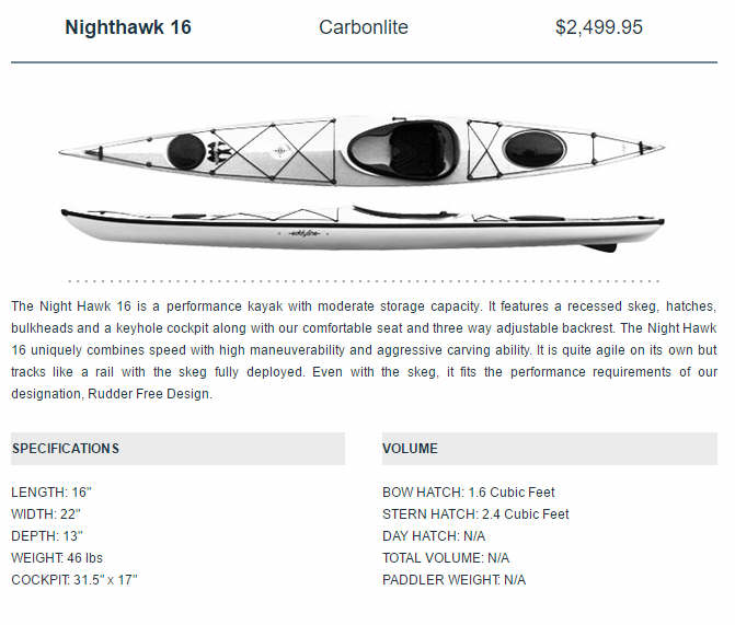 The Eddyline 'Nighthawk' is a nice transitional kayak with a shallow vee bottom that makes it feel tippy at first but also results in a consistent righting moment as the kayak tilts. The kayak is constructed of a lighter polycarbonate plastic than the polyethylene Capella so it is easier to carry, but still can take banging around on rocks. In rough water it is not as smooth a paddle as the Capella which has a better bow shape. It tends to pound in waves as opposed to cuttng through. It is a perfect kayak for medium size people who want to move up from a smaller recreational kayak to a sea kayak. |