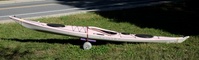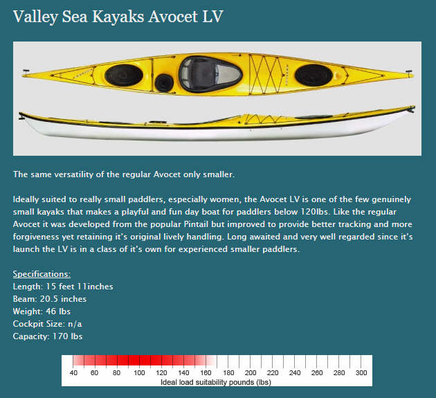 The fiberglass Valley 'Avocet LV' is a kayak specifically designed for smaller women less than 120 pounds. It will handle a larger person up to about 5" 10" with the foot pegs fully extended. Being fiberglass it is more suscreptable to damage on rocks, but has the feeling of a high performance kayak for intermediate and advanced paddlers. It has a very feminine strawberry pink deck over a light gray hull. |