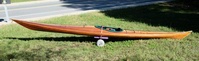 The cedar strip kayak 'Outer Island' is a handmade kayak graciously donated to our chapter by James Doyle of New London, Conneticut. It is a beautiful stable kayak with a little lower volume than the Capella but perfect for medium size paddlers. It is fitted with a aftermarket foam seat that is best for men and women with medium to narrow hips. We have another seat that can be velcro'ed in that does not have side pads and allows more width for those with wider hips. It has nice consistent stability, so no suprises when edging the kayak for turns or in rough water. Because of the technique for wooden strip construction, the thigh braces are not as comfortable as some commercial kayaks, but still are functional. We also have traditional Greenland paddles that can be used if the paddler wishes to stay "fully wooden" while paddling this kayak. Because of the thin hull (fiberglass over and under thin cedar striping) this kayak will not be allowed to be used where it may be bounced on rocky beaches or in rocky shallows. This kayak does not have a skeg or rudder but is fairly neutral to weather cocking and tracks nicely. |