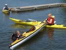 Paddle training was held at Grosvenor Camp in North Kingston. -- View photos of one of our training sessions. Some photos demonstrate the standard assisted rescue called the "T" rescue, where the kayak is overturned to empty out the water, and then the paddler is assisted in getting back in their kayak. |