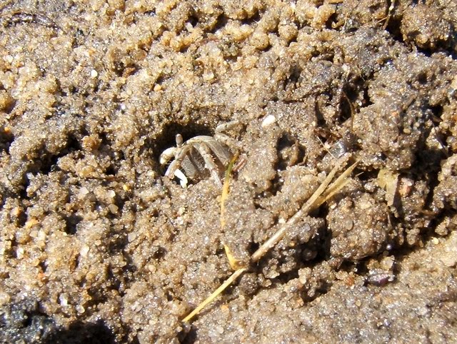 A closer view of the crab in its hole. Notice the balls of waste around the hole.