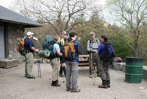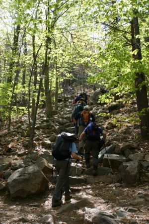 Saturday morning found most of us gathering at 8 am for the drive up north where me met a few more folks. The beginning of our adventure was right at the Blue Hills Reservation parking lot: We walked through the Visitor Center area to find the zoo and were happy to see a river otter and breathtaking white snowy owl on display in the little zoo. Rain was threatened but never carried out. We remarked all day how fortunate we were to have both temperature and humidity which were perfect for hiking. Only the slightest breezes were felt and enjoyed while we were hot. Overcast skies kept us from worrying about sunburns and overheating. We were treated to sun and clear skies at the trails end. ![]() Uphill in Blue Hills ReservationWe started uphill from our cars and soon reached the tower. Here we were treated to the first mini-seminar about equipment and packing. Trip Leaders Steve Harrison and Sue Warthman both carried full-sized packs with everything needed for a serious North Country day hike. They doled out a wealth of information about what is vitally important (adequate water), what is nice to have (coffee-brewing equipment) and how to put it all together. We could all tell that the voice of experience was speaking about how to make things easier on ourselves and how to be prepared for the worst-case scenario. Most laypeople would not consider bringing a sleeping bag, pad, stove and extra clothes on a day hike but we were lead to understand why this is a good idea. |