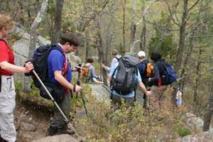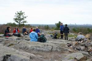 The landscape of the Reservation is typical Southern New England hiking with rocky ascents and bus-sized boulders to leapfrog. Leaves were just beginning to show in shades of extra-bright-new green during our visit, the color enhanced by diffusely lit skies. Only a few wildflowers were peeking out so far. Swamps, marshes and ponds also lie in wait throughout the area but we stayed in mostly dry areas. We saw a few distant birds but none of the Reservation’s more interesting residents such as coyotes and rattlesnakes. ![]() Lunch View of BostonWe stopped for lunch at the top of Buck Hill in full glorious view of Boston, the harbor and islands. Ron and Steve entertained the rest of us with tales of hiking glory/terror. No, Steve was not wearing a black kilt today but hiking shorts with gators. He made sure we were all jacketed in the cool breezes of the open summit, another example of good hiking practices. To the same end Sue reminded us to snack and drink at every rest stop. We were halfway around the Blue Line Trail at this point so we headed back towards the cars. A quick map demonstration showed how we would pass by some hills we had already scaled in favor of somewhat flatter ground. Several times the upcoming Map and Compass Workshop was impressed upon us as an important part of our hiking education. The group expressed a lot of interest in future Step-By-Step hikes and was also encouraged to attend June’s Wildflower hike in NH to further whet our whistles for the really hard stuff. ![]() Rocky TrailsOur last 45-or-so minutes were spent in lovely unexpected sunshine. It felt good in combination with the cool gentle breeze and perked up the forest with new energy. Or maybe that was just our tired spirits. We all left feeling well-schooled, happy and only a little sore, looking forward to a full hiking season. For everyone who has wanted to venture outside their RI (read: mountain-free) comfort zone and get serious about hiking, the season is still very young. This program will give you the tools and confidence to start checking places off your life list. Get out there! |