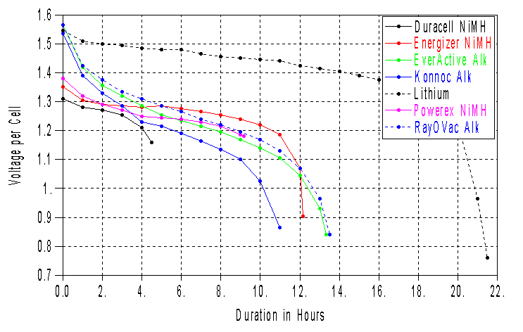 The AA alkaline and Lithium batteries were fresh from Walmart and the NiMH batteries were freshly charged in a quality charger. The prices listed are approximate, depending on where you can buy them. This tests were done as the result of questioning some NiMH (commercial Duracell batteries obtained at a flea market several years ago) lasting only 4 hours, while the advertised duration was supposed to be 14 hours with alkaline batteries. The following table shows that the Lithium AA cells give the longest time with over 21 hours power, but at a severe cost of about $4.75 per run. (The Magellan GPS requires two AA batteries for power.) The alkaline batteries, at about $1 per run, last about the same as the Magellan 14 hour advertised life, except for the Konnoc (China) batteries ($0.50/run) obtained in a local Job Lot store. There was no appreciable difference between the RayOVac and the Walmart 'EverActive' house brand. The NiMH rechargeables were the obvious choice for long term use. The 2000 mAh lasted around 9 hours and the 2300 mAh lasted 12 hours, the latter about the same as the alkaline batteries.