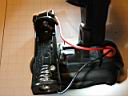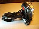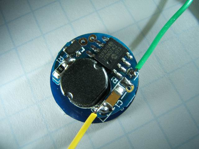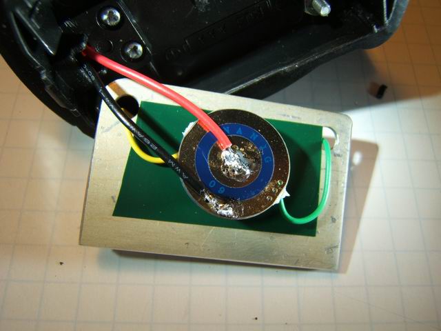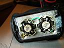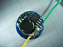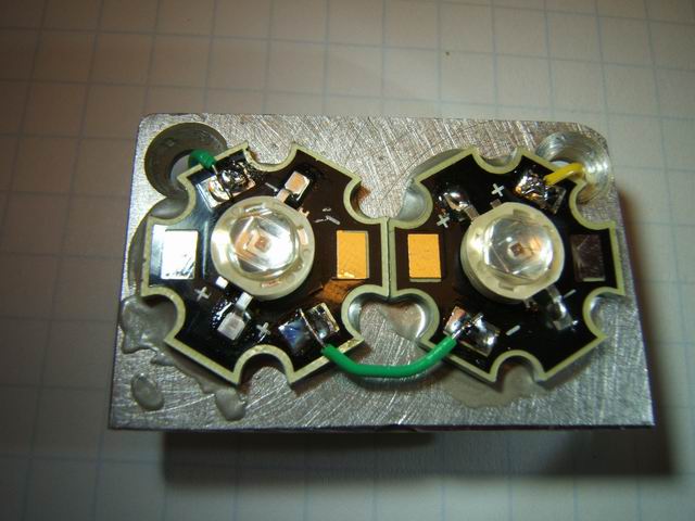 The regulator used is the same as prototype 13 and 15 (DX SKU-7302) which supplies 3.7v to the two LEDs in series. The original wires that came attached to the regulator were too thin (I had wires break in one of the other prototypes.) and I replaced them as seen in the first photo below. For this prototype I used the generic red LEDs that were used in prototype 13 because, I had some, and with the clear lens I wanted to see what the lesser LEDs would do before trying Cree LEDs. The star LEDs are bonded to the heat sink plate (hand cut 1/8” Al) with Arctic Silver Thermal Adhesive. The bottom of the heat sink has a piece of electrical tape to prevent shorting. The (+) and (-) wires are soldered to the regulator in the last photo.