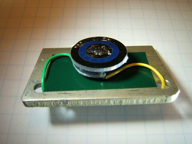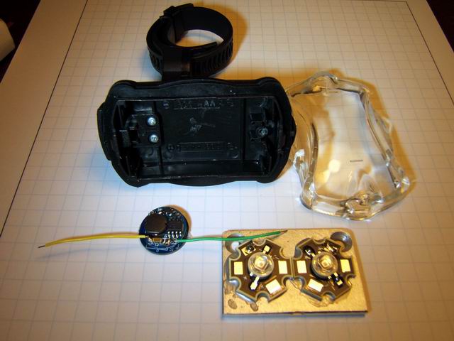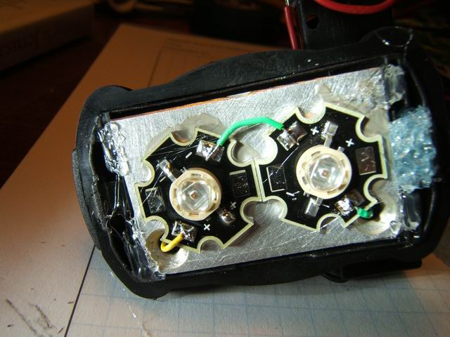 The heat sink plate is held in the flasher body by a small amount of urethane glue at the corners of the housing. This is only to keep the LED assembly from bouncing around inside, There is no room for any other means of attachment. The final flasher is seen in the last two photos.