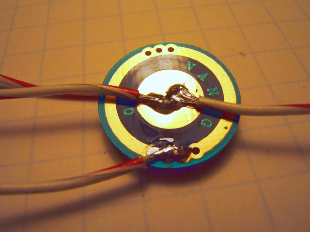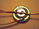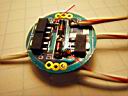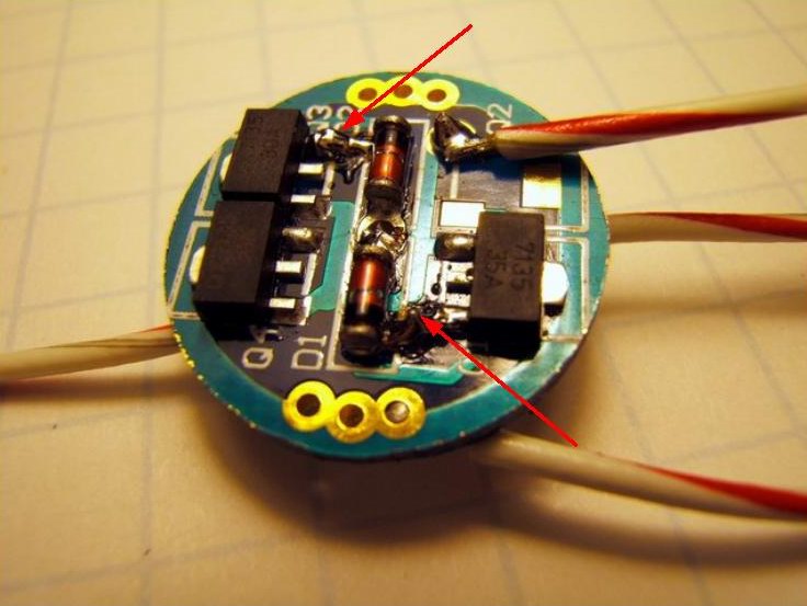 To further reduce the cost of the bike light, this prototype uses only one Cree 3 Watt LED. The idea being that for casual riding on a bike path or quiet streets a single LED should be enough. This light uses a brighter Cree LED than the other models. It uses a bin Q5 vs the P4. (I had ordered a Q5 just to see the difference.) To make sure it had enough light the current regulator was a DX SKU-1885 which provides 1000 ma for a 3 watt LED. The DX SKU-1885 comes with three AMC7135 chips on the board. (Read this forum thread before selecting cheap drivers. Especially if you are considering using Li-ion batteries.) Each chip contributes 350 ma and the board comes with one active, so two more must be put in parallel by solder bridging the gaps shown in the photo below. Red arrows show where to jumper the circuit board. I used a 9 watt soldering iron instead of my normal 25 watt iron. The Q2 pad is the (-) output. The next photo shows the bottom of the circuit board with the input and output (+) in the center and the (-) input on the ring. The regulator board is held in place by its wires and firmed up with a spot of silicone adhesive as seen in the last photo.