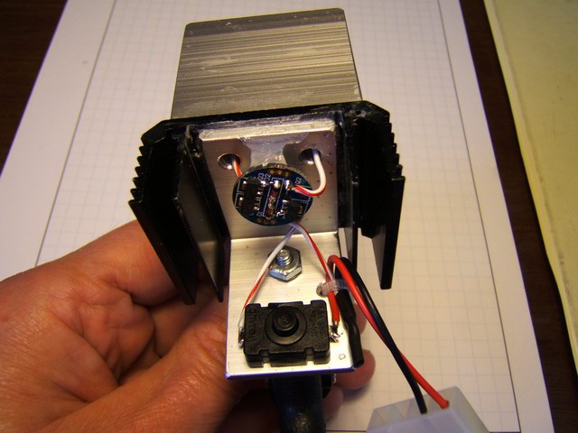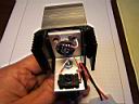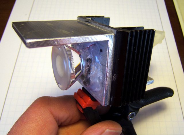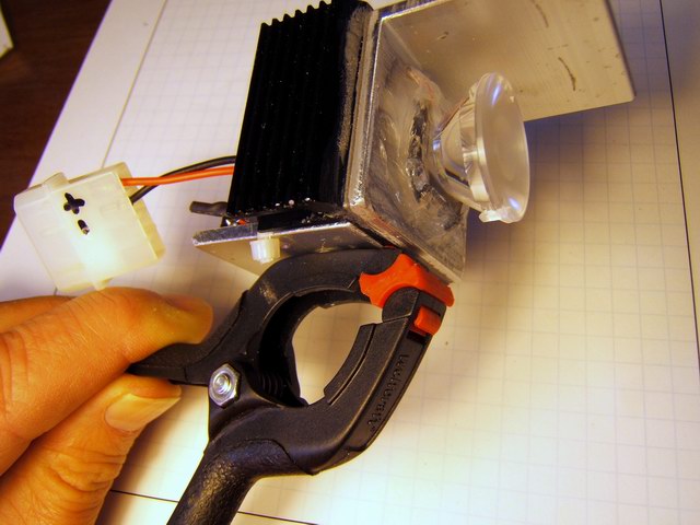 The heat sink is from a surplus TO-3 power transistor bonded to the 1 ½ “ aluminum angle stock. At this point I purchased some Arctic Silver Thermal Adhesive which I used to bond the star LEDs to the heat sink. The thermal conductivity of this epoxy is much greater than the JB Weld, in theory keeping the LED emitter cooler. With the bonding thickness so thin, the temperature drop across the bond is a small part of the heat transfer path. The L2 optics OPTX lens was bonded to the heat sink with GE Silicone II adhesive, in addition to the sticky rubber backing.