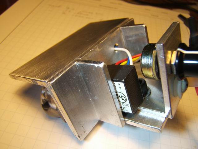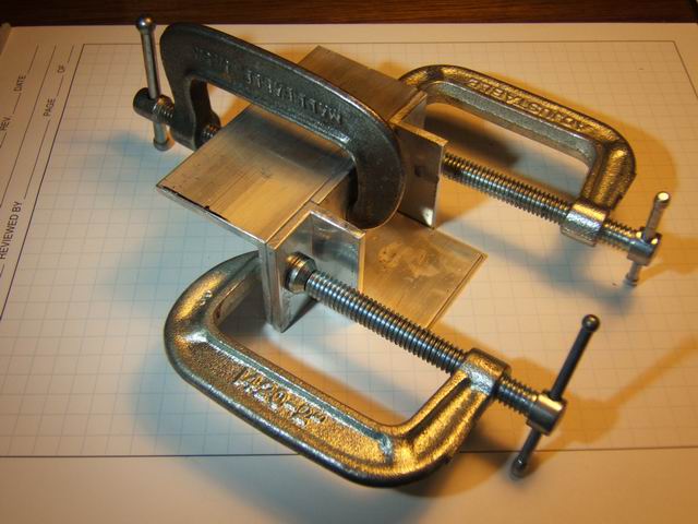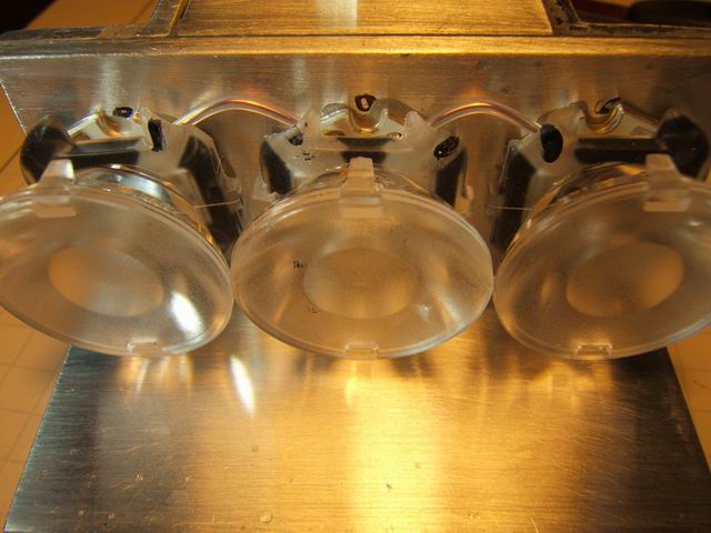 This light is a revision of prototype 2, constructed of 1 ½ “ and 3/4” aluminum angle stock instead of a commercial heat sink. I also made two bases for this prototype. The width of the light is 3” which was dictated by the space needed by the L2 optics. This unit has about the the same heat sinking ability as Prototype 2 and is easier to construct. All the pieces were clamped and bonded together with JB Weld epoxy. There is a rear angle that was not bonded (for construction convenience) to the base, but was bolted to the base with the clamp bolt. Heat sink compounded can be used between the bolted surfaces.