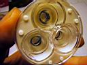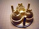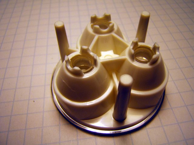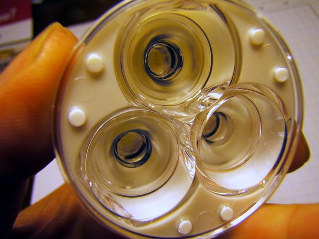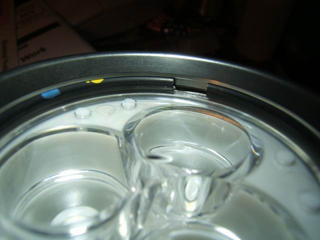This DX SKU-4630 triple lens was designed specifically for the SSC LEDs and does not focus the Cree LEDs. So this unit has three 3 watt SSC LEDs in series while using a 12 volt gel cell. The photos below show the progression in setting up the star LEDs and the optics. The stars are placed (notches in optics hold them) into their sockets as in photo 3. With the mounting slug placed on the bottom in photo 4 you can see there is clearance that need to be reduced. In this case by snipping off bottom of the optic feet.