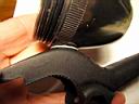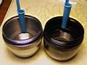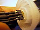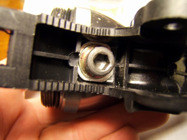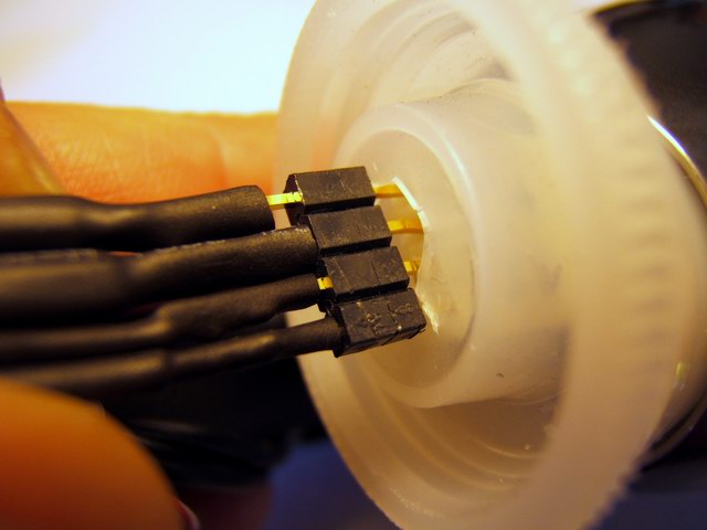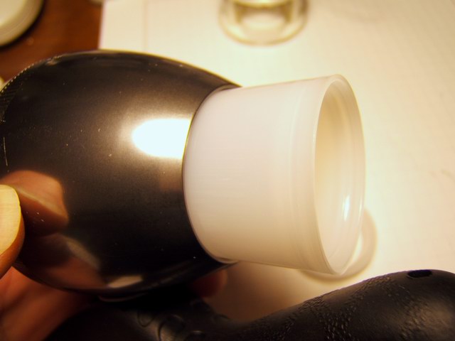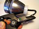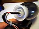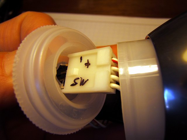 To electrically insulate the bFlex from the aluminum walls of the Mag-lite, I used a plastic film cannister which was able to be screwed into the rear of the Mag-lite head. Just another one of those lucky coincidences when you have enough junk laying around. The LEDs assembly was passed in from the front of the light. After the unit was assembled, the rear connector (homemade hack) with the switch and power cord was plugged into the bFlex. The cannister cap then closed of the rear light. The design is not waterproof but could be if required. The momentary contact switch was mounted on the side of the plastic clamp so that I could tap it with my left thumb while riding.