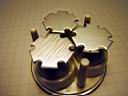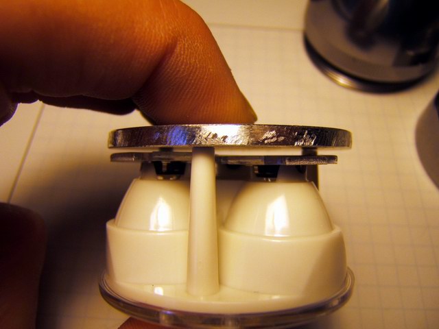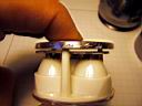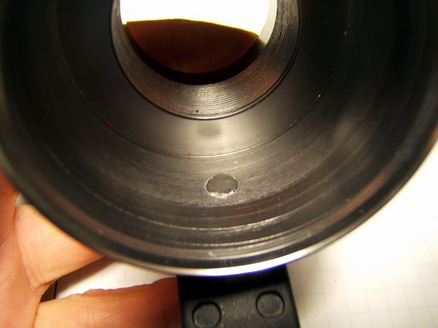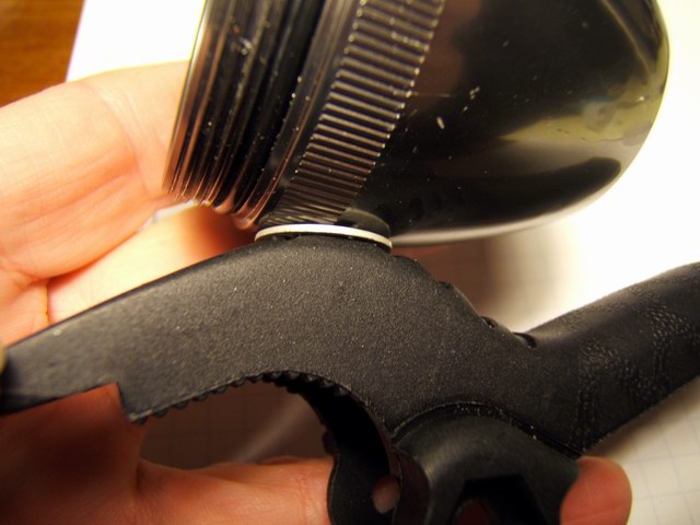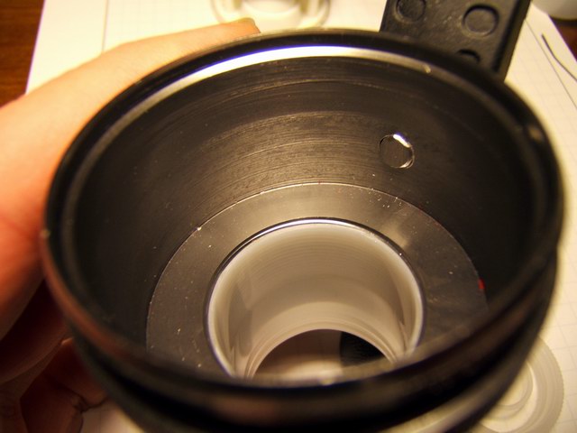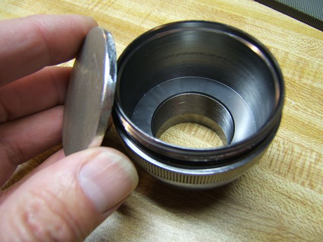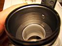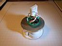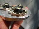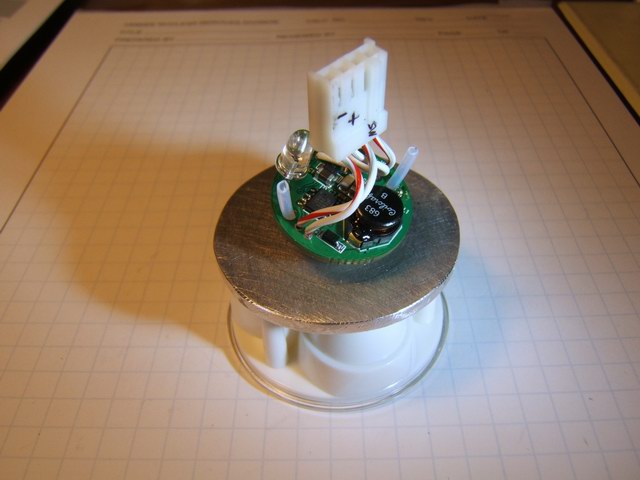 One problem with this design is the lack of a good heat sink, so the light heats up quite fast and even with a good breeze over the unit, the internals get hot enough to automatically reduce the power (I have the programmable trip point set at 80 C/176 F) to the LEDs. Even with the plastic cap off the back, the units heat up and reduces the light from full power to 1/3 after 15 minutes or so in a light breeze. This prototype obviously demonstrates that this Mag-lite C design does not have sufficient heat dissipation. Another difficulty associated with this design is the fuss factor wiring up the bFlex to the heat sink slug and rear connector. Bonding the star LEDs on the aluminum plate is an exact process. There is not much room for error, the lens must fit exactly and tightly over the LEDs. The total height of the internal assembly was just shy of the available space when the bezel is screwed down. So I had to insert a makeshift o-ring for a spacer to keep the heat sink assembly tight against the Mag-lite head. Heat sink compound mates the aluminum plate with the inside ledge to transfer heat to the Mag-lite head and pressure alone makes the thermal contact.
