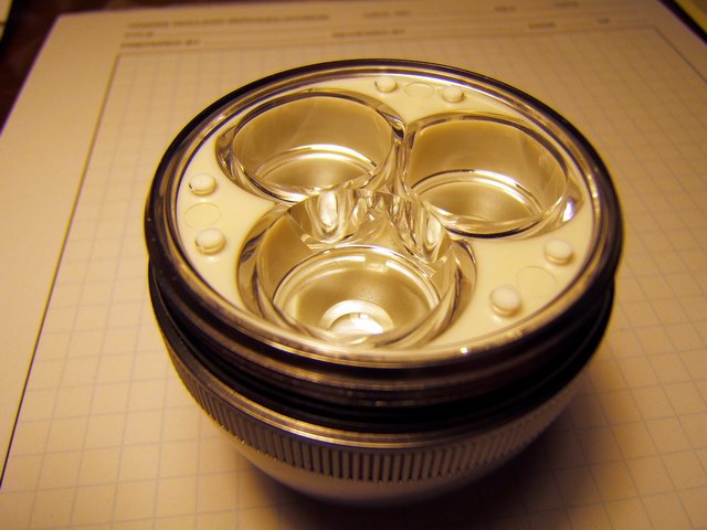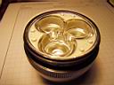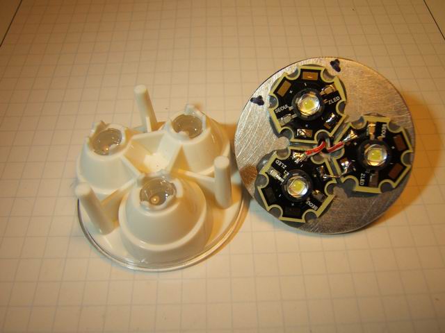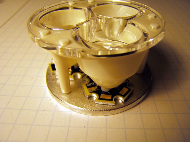 This was an attempt to upgrade the Cheap 20 watt Bike Light with LEDs. This light uses a 2 cell C Mag-lite head. (Specifically the silver model.) It happened that a specific DX SKU-4630 triple lens would fit the depth of this Mag-lite head with minor adjustment on the lens standoffs. If you don't have a Mag-lite around to hack apart the prototype will cost you from $14-18 more.