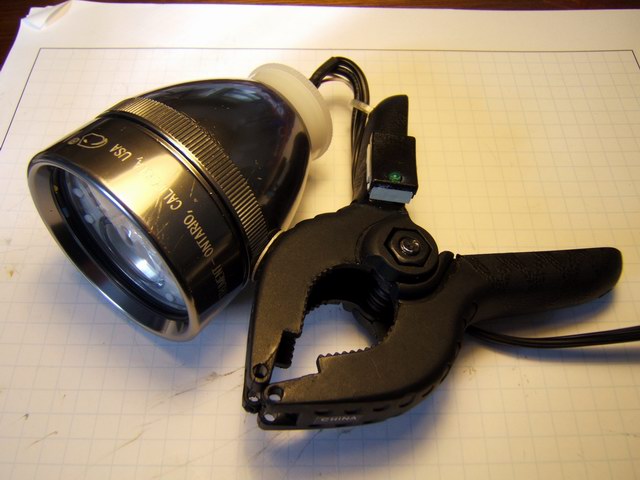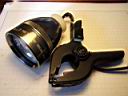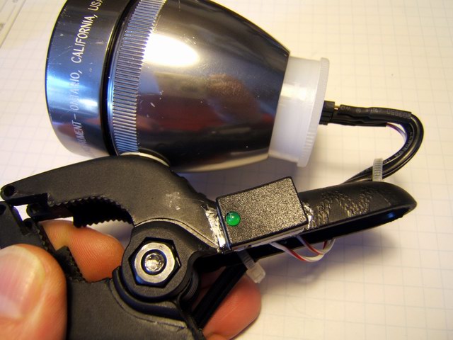 A hole must be drilled (before assembly) in the bottom of the Mag-lite head for the plastic clamp. It must be in a precise location and length to not interfere with the heat sink assembly. I had to grind the cap screw to the proper length. An operational difference for this prototype is that the controller requires a lot of clicking and pressing of the switch to change light levels. The rotary potentiometer in the other prototypes is quicker to vary, but not as precise. The beam for this tri-optic is a sharply defined round, evenly distributed cone pattern of about 30 degrees. I don't think the light output is as great as the aluminum angle prototypes.