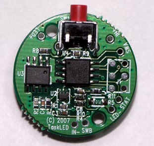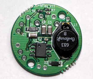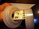 I tried various combinations of the Mag-lite head with hacksawed extensions on the rear , but nothing worked well. Pieces that screw together and have components attached, tend to get wires twisted during assembly. So I decided that for this prototype I would leave the bFlex loose in the back of the light. I used a Teflon tube that acted as a standoff (see photo above) to keep the bFlex from contacting the aluminum heat sink. ( The latest version of the circuit board does not have the large holes that I used to pass the Teflon tubing through.) That way the temperature sensor chip on the bFlex was still able to face the heat sink and monitor the temperature. I attached the red LED indicator on the board itself. The photos above show the assembly.